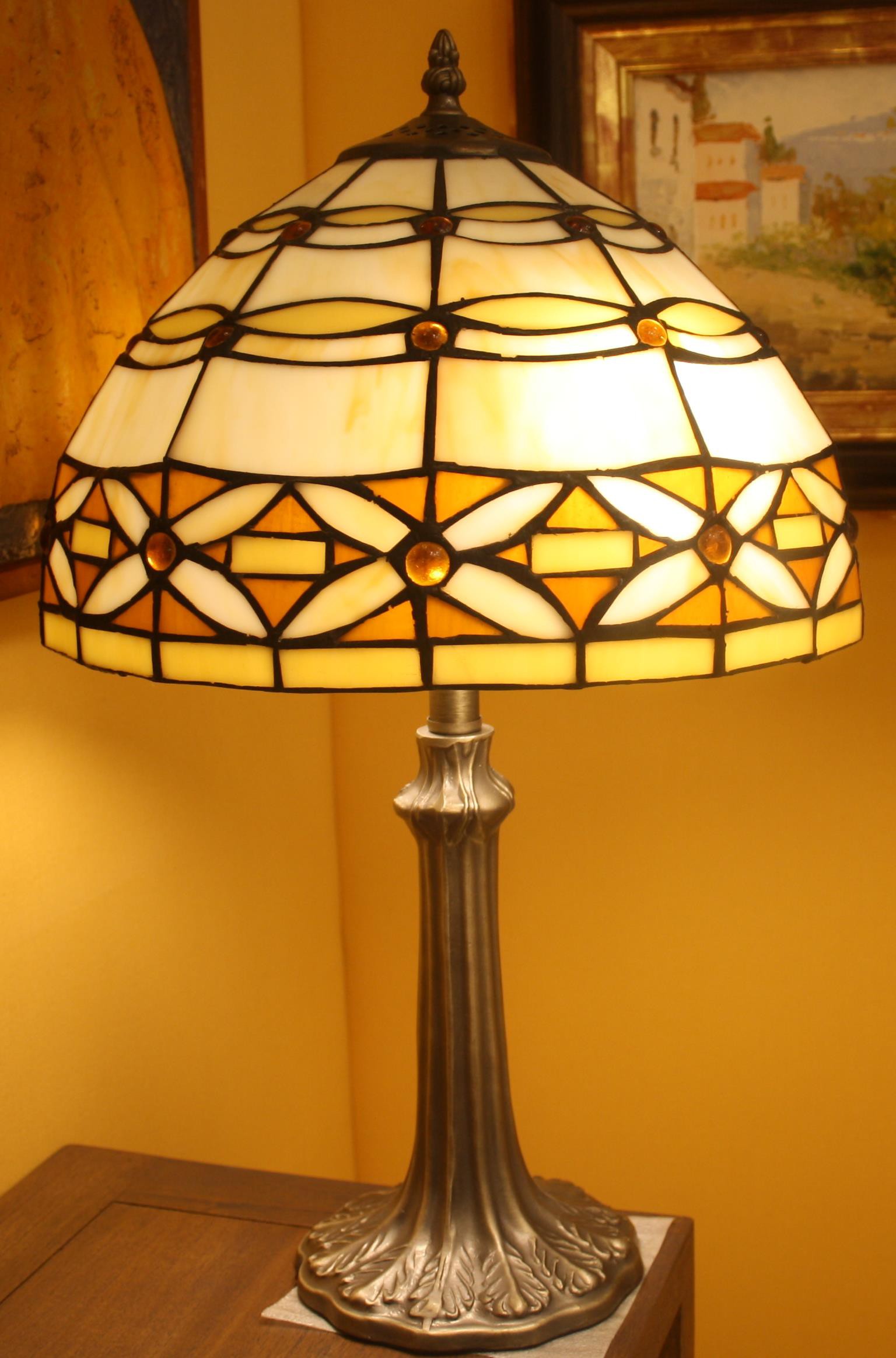 LAMPARA TIFFANY DE SOBREMESA, HECHA A MANO CON OPALINAS ORIGINARIAS DE EE.UU EMPLOMADAS A MANO CON CERTIFICADO, PIE EN BRONCE